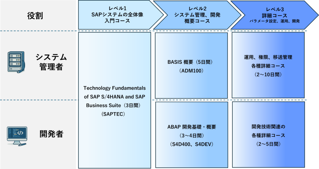 ※SAP HANA、BTP、SuccessFactors など図に載っていない分野のコースも存在します。